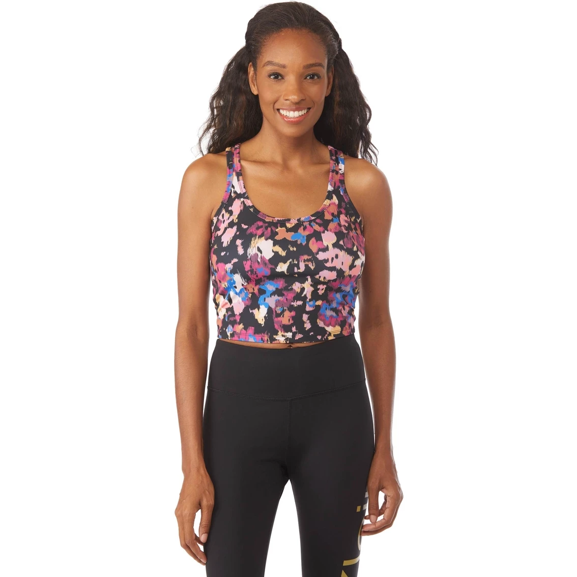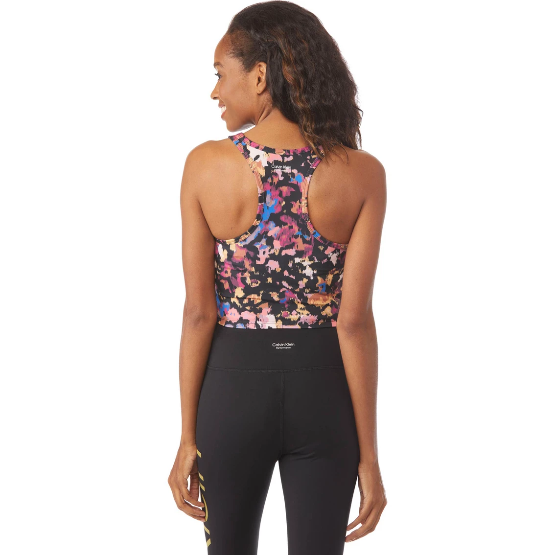 This Calvin Klein Performance Printed Scoop Neck Crop Top features a scatter multicolor print, crop fit and a scoop neckline. It’s perfect to pair back to matching leggings. Made of polyester and spandex to move with you. Style: PF2T0478015.
