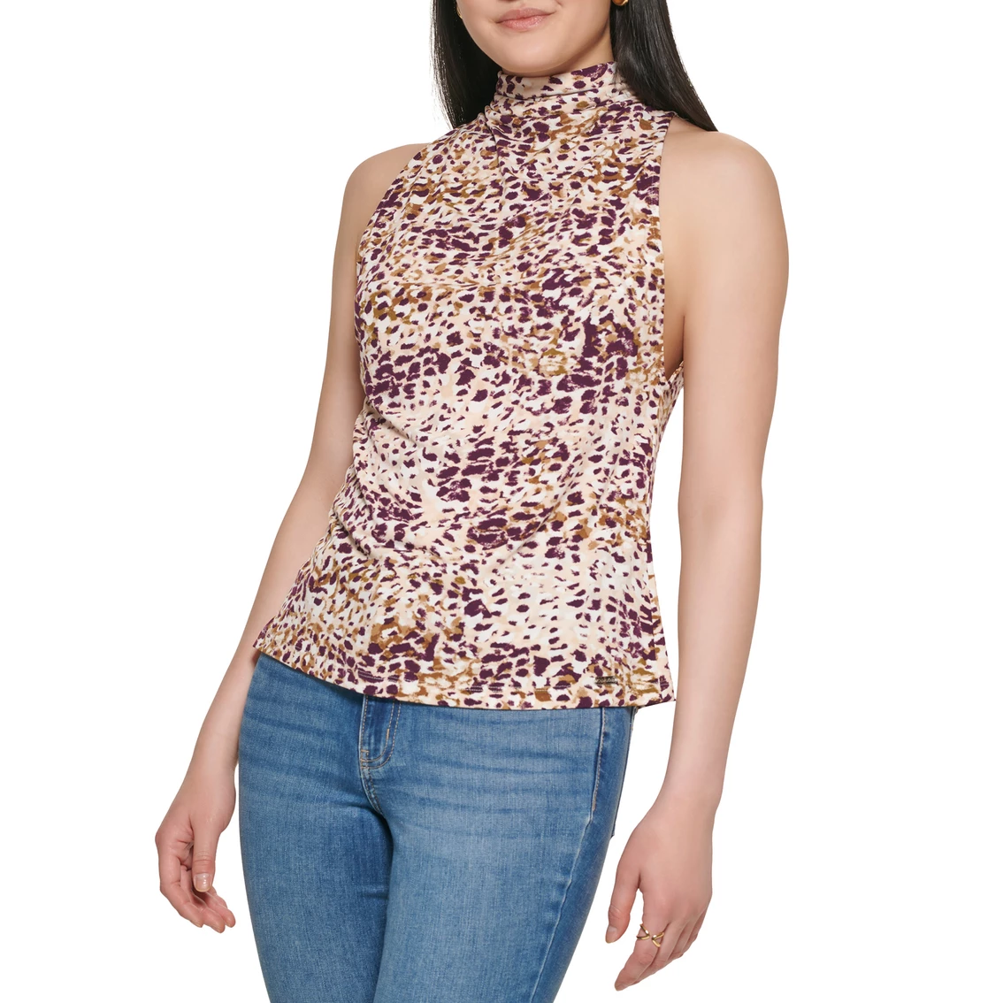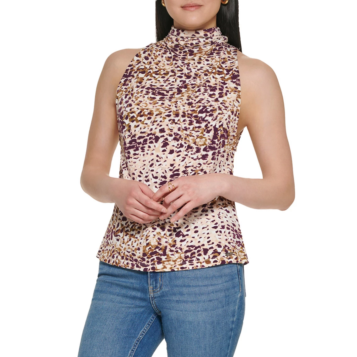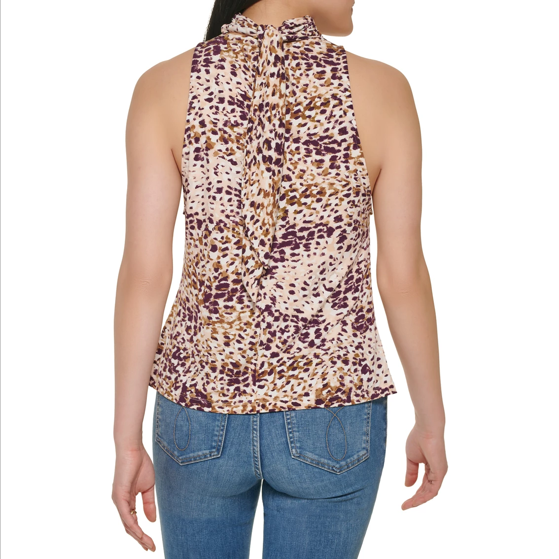 Crafted from a printed matte jersey fabrication, this Calvin Klein top features a sleeveless silhouette with a back tie detail. It has a bold pattern that’s sure to make an excellent centerpiece to your next ensemble. Pair it with your favorite denim or skirt for a look that’s perfect for day or night.