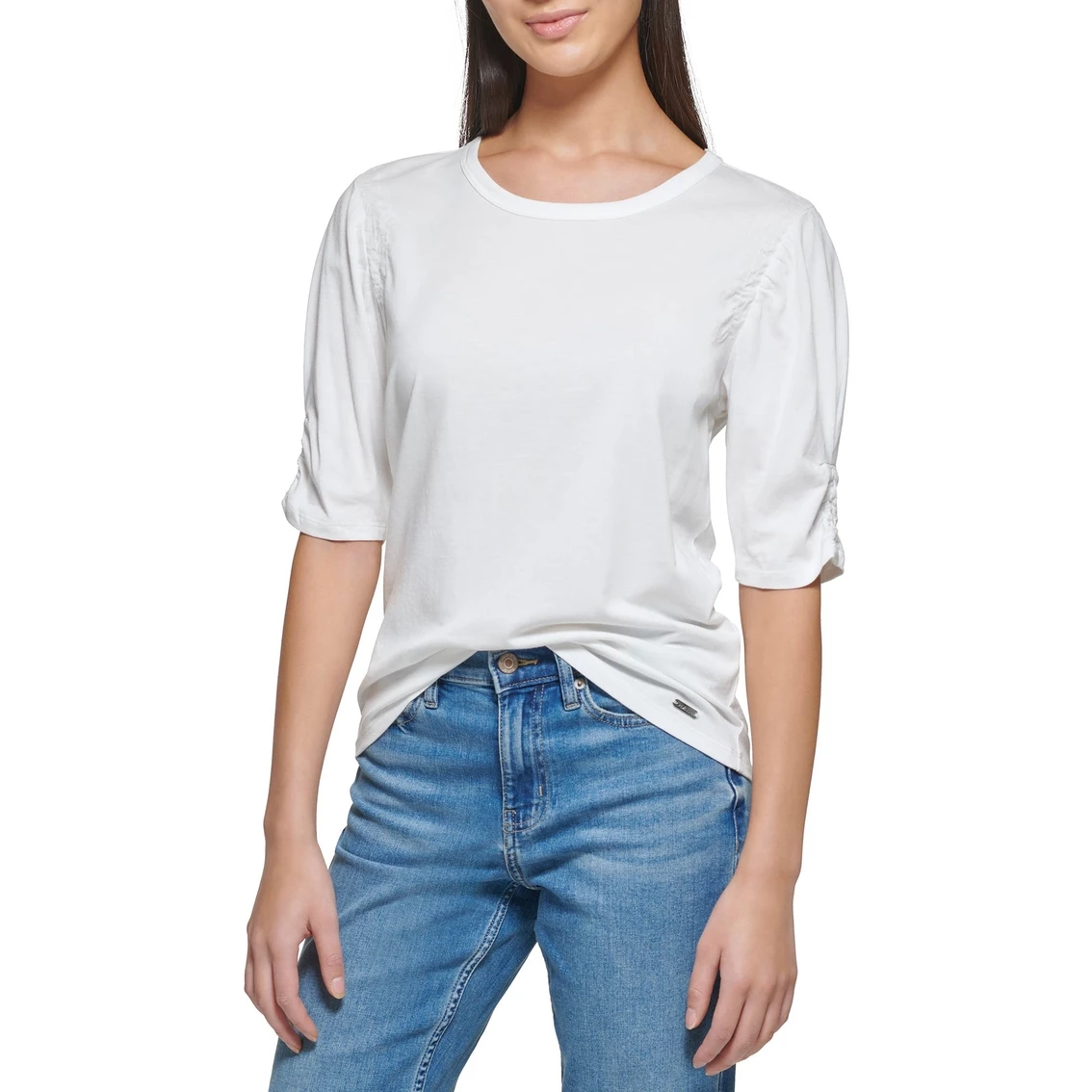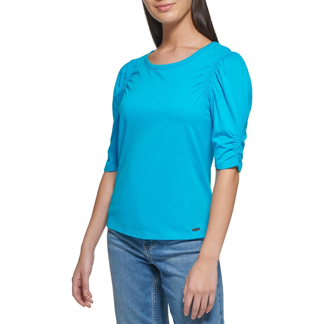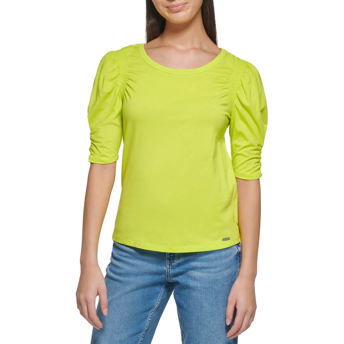 Accentuate your style with the Calvin Klein Smocked Shoulder Top. This smocked shoulder sleeve adds flair to your everyday attire. Pair this short sleeve top with denim, shorts or your favorite skirt. Style: M2EHV069001.