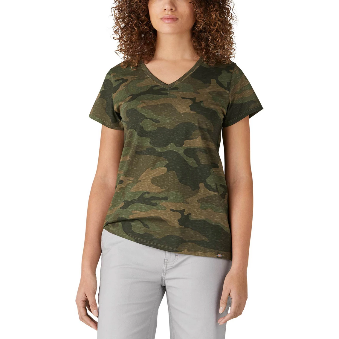 Ease into your workday with the comfort of this Dickies women’s short sleeve, V-neck t-shirt. It’s perfect for bending and stretching because the longer back hem keeps you covered. Made with a regular fit that’s not restrictive, this shirt is also tagless so you don’t have that little itch on the back of your neck. It’s a 100% cotton design that remains soft to the touch and keeps you comfortable all day. Regular fit. Dyed to match logo label on front hem. Style: FS201386.