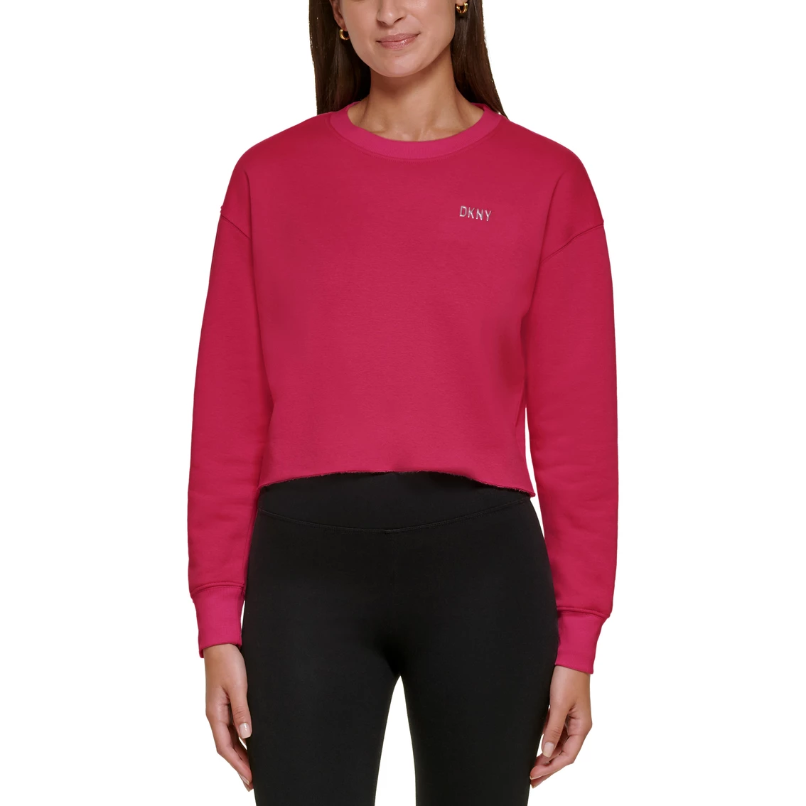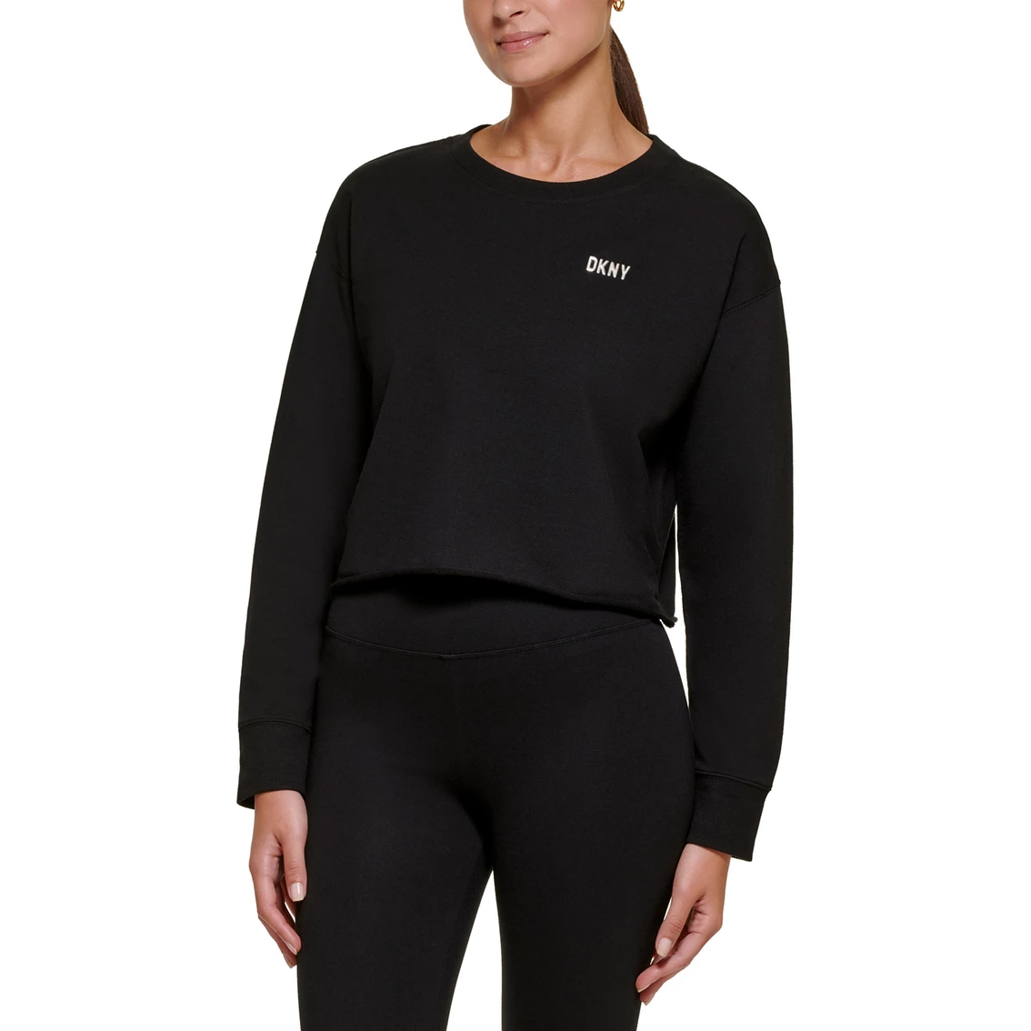 Upgrade your sporty look with this long sleeve crew neck cropped top from DKNY Sport. It features a metallic logo detail. The DKNY Sport Metallic Logo Cropped Pullover Top will be a go-to in your wardrobe this season. Style: DP2T9063046.