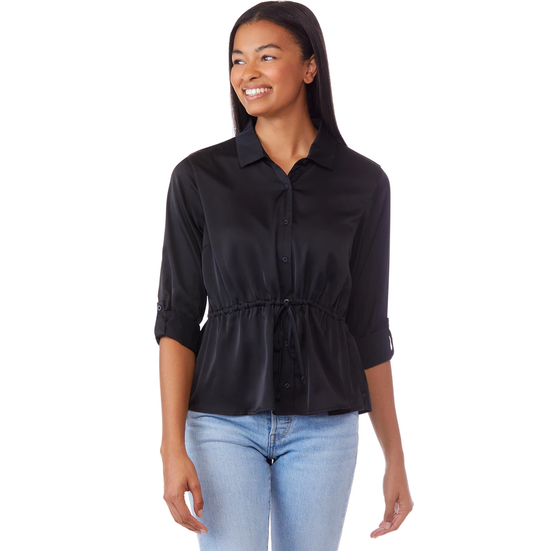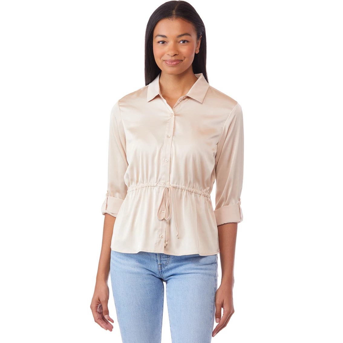 Ever After brings her this classy, feminine top. It is made of a washed satin and has a button-up front, a soft satin feel, tie waist, roll tab sleeves and a collared neckline. Style: 1122J.