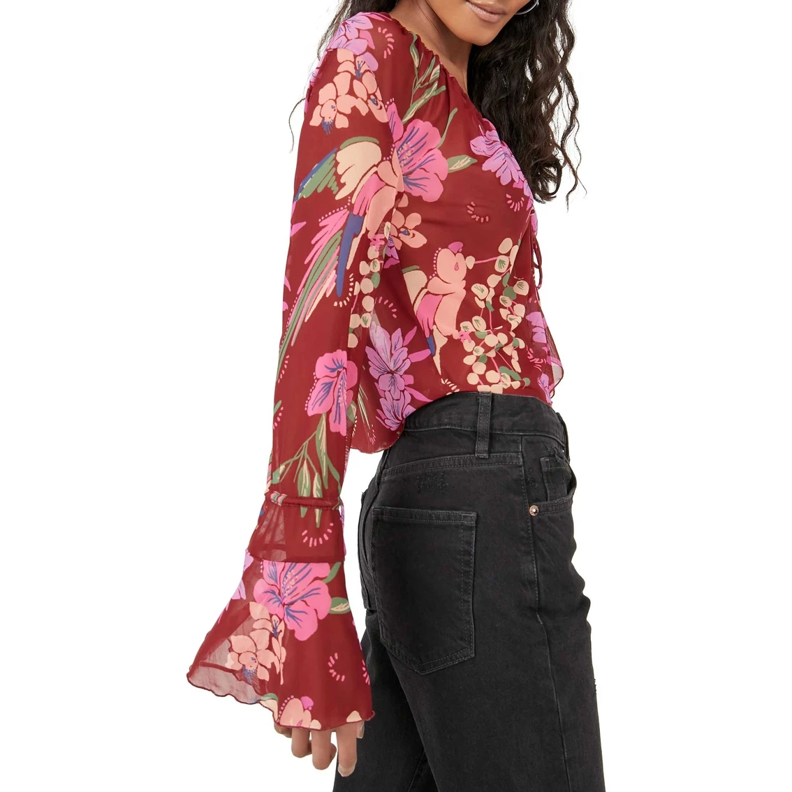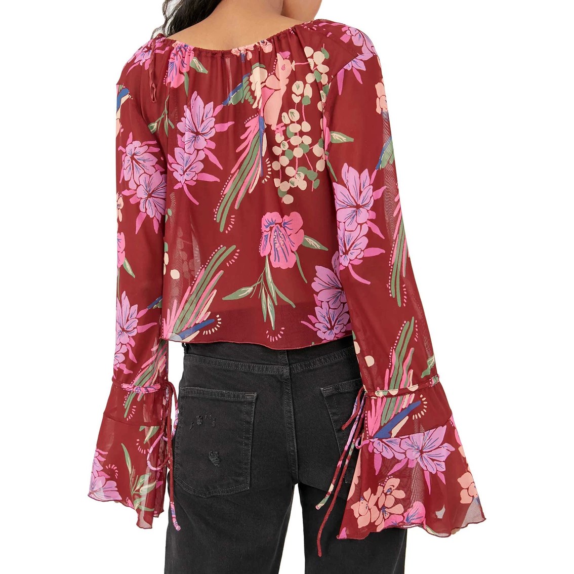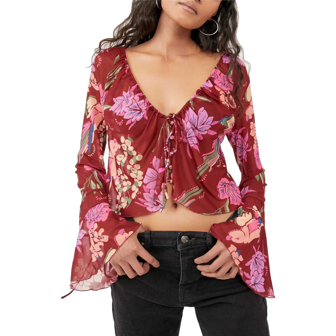 This goes-with-anything blouse from Free People is perfectly printed in a retro-inspired design. It features a drawstring, V-neckline and exaggerated bell sleeves for added shape. Style: OB1466366200.
