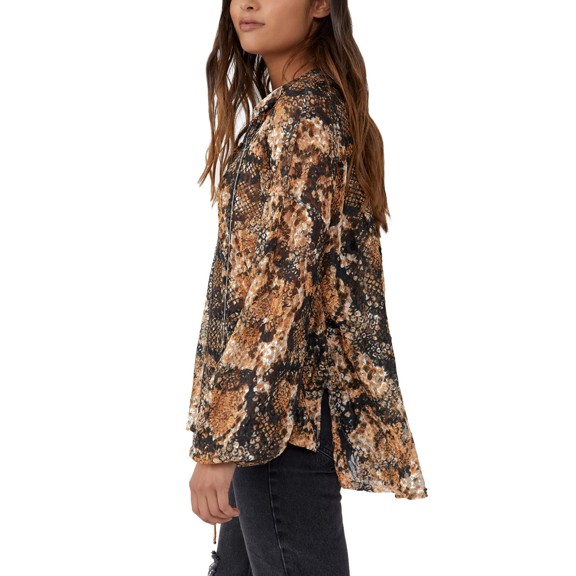Perfectly printed in a sheer fabrication, this timeless Free People blouse is featured in a drapey, oversized silhouette with tie detail at neckline for added versatility. Style: OB1515934710.