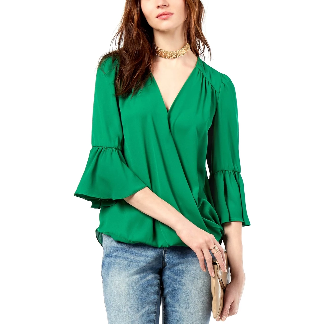 Styled with a surplice neck and 3/4-length bell sleeves, this petite high-low blouse from INC International Concepts drapes beautifully and matches perfectly with any bottom.