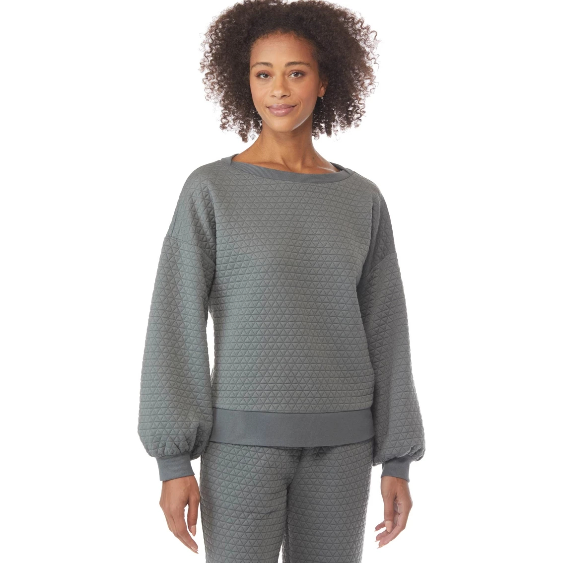 Designed exclusively for the Exchange, JW offers quality designs for great prices. This quilted top adds elegance to your casual wardrobe. It features a boatneck, long balloon sleeves and a banded bottom. The top hits at the hips. Made of polyester and spandex, the garment is machine washable for easy care. Style: 3202JS0092.