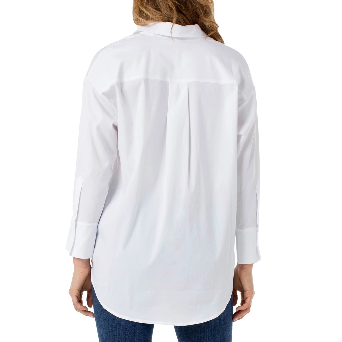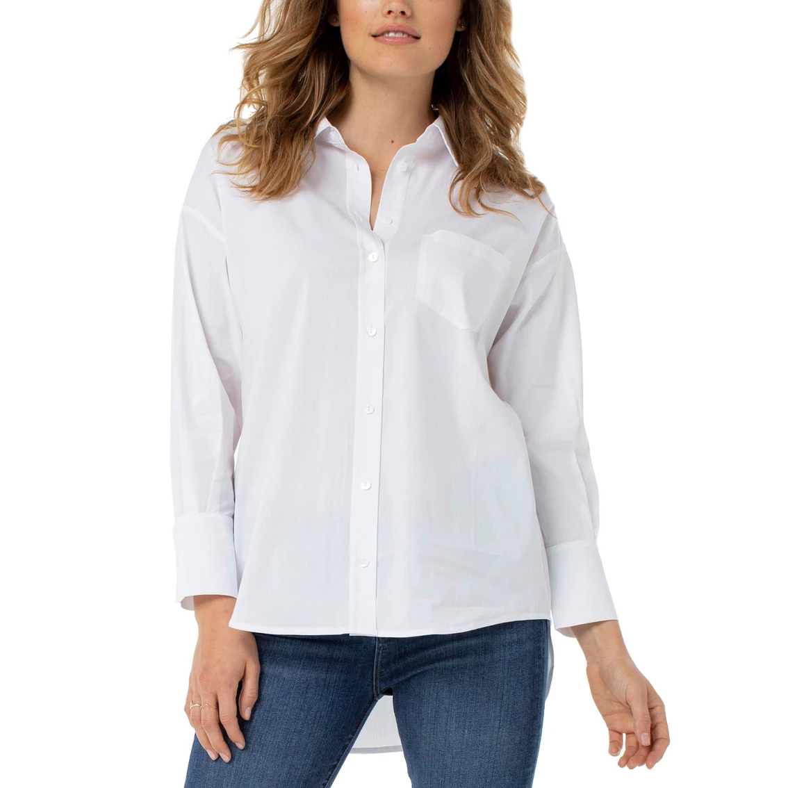Oversize Button Down Shirt. Classic, versatile, and a timeless essential. Liverpool calls this their Great White Shirt and everyone needs this! This fabulous stretch poplin shirt is fantastic from season to season. Hi-low hem detail. Wide cuff detail with button closure. May size down if in between sizes. Style: LM8167G52.