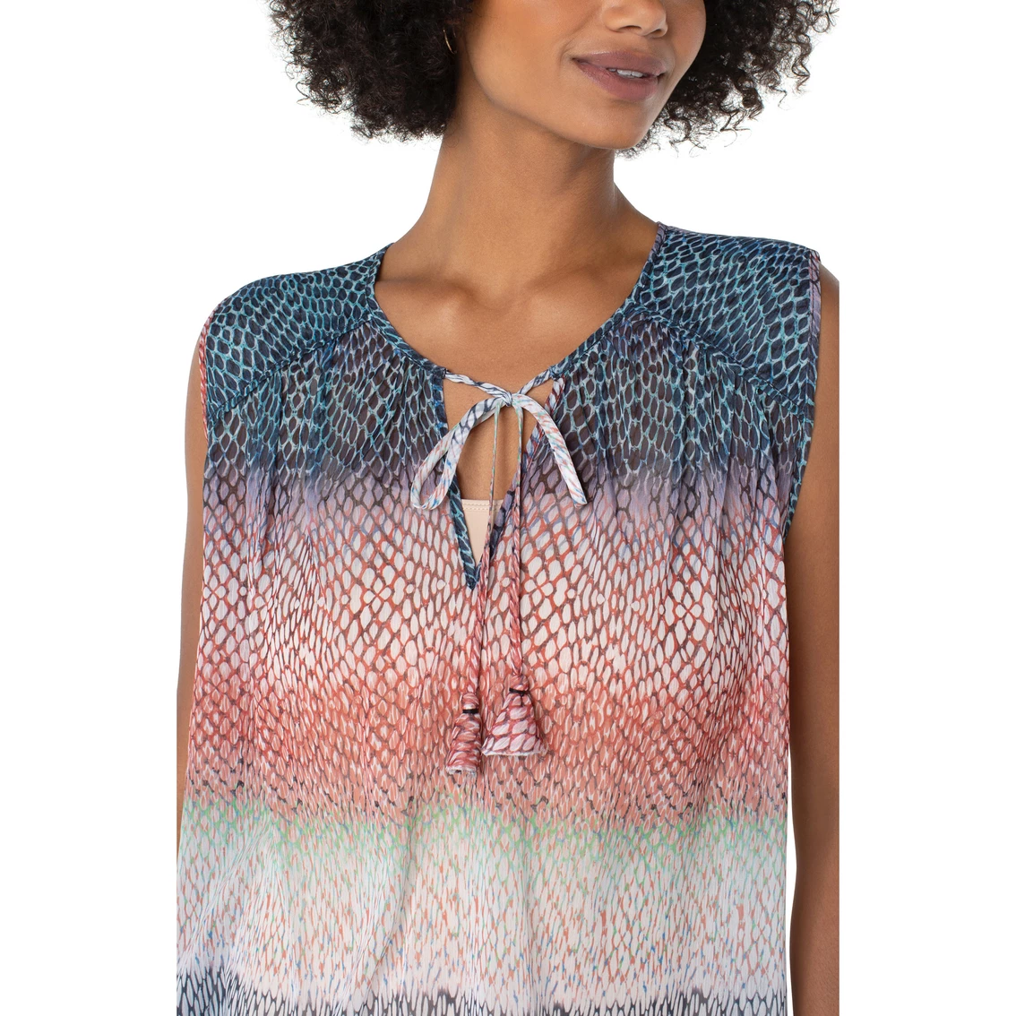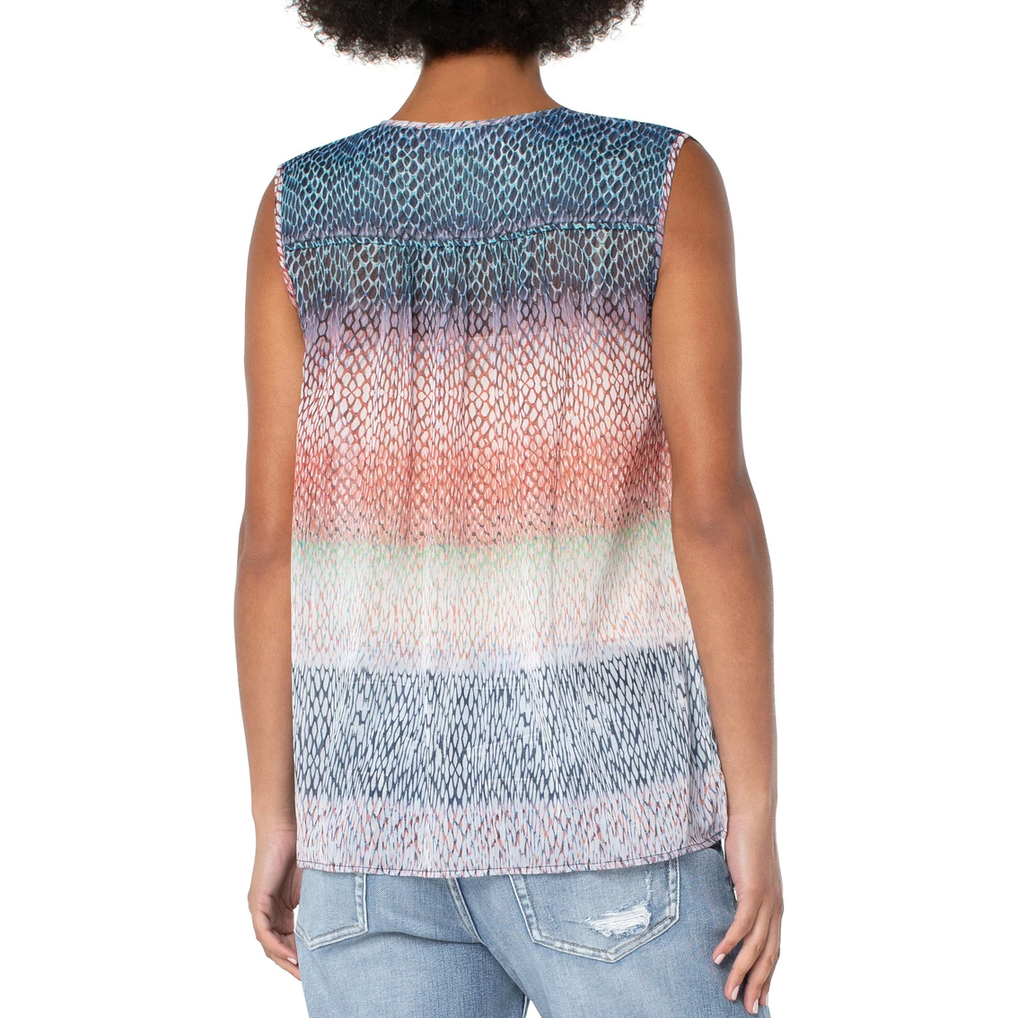 Liverpool’s sleeveless tie front top is a must! Super lightweight in this crinkle chiffon ombre snake print and it pairs with just about anything!