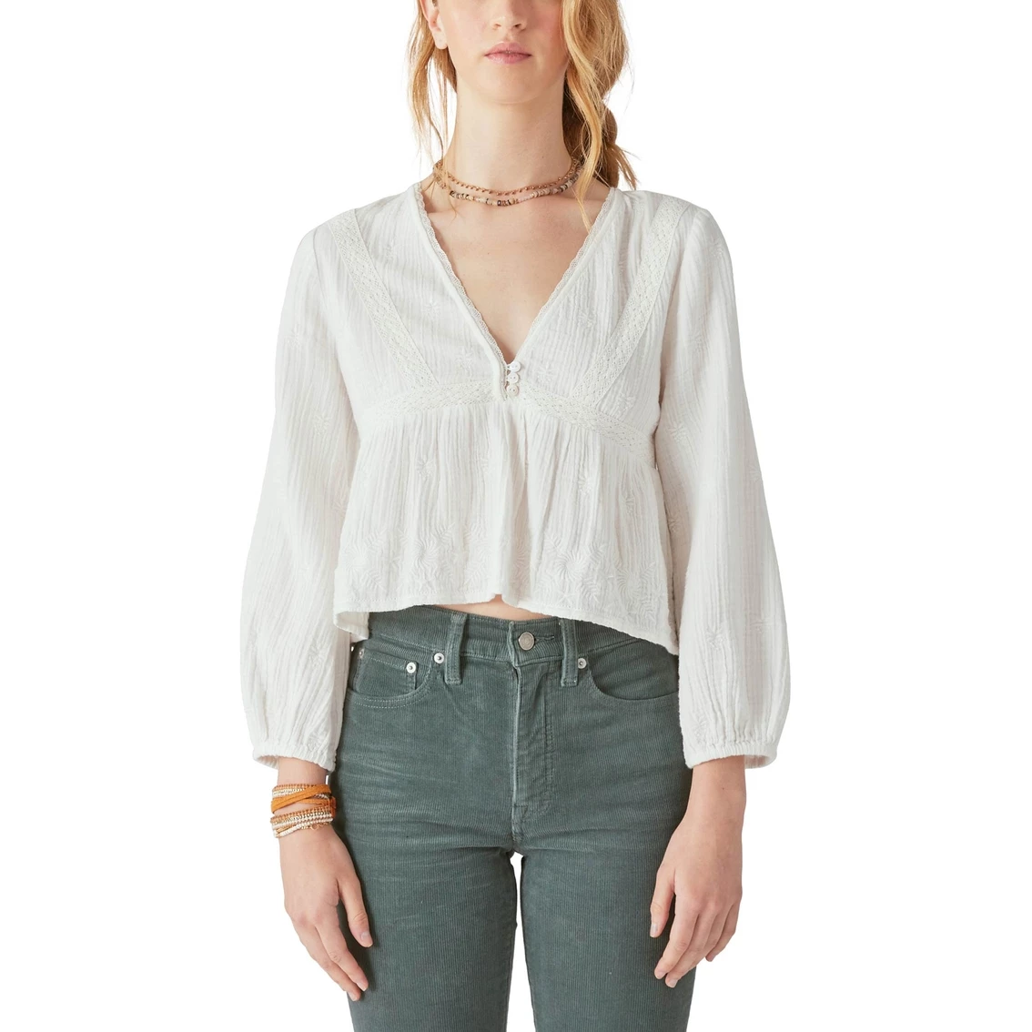 Add a feminine touch to your look with this dreamy top from Lucky Brand. It’s crafted in soft, lightly-lined fabric that’s decorated with an inset lace. Layer it over an essential cami tank for the complete look. Style: 7W46518103.