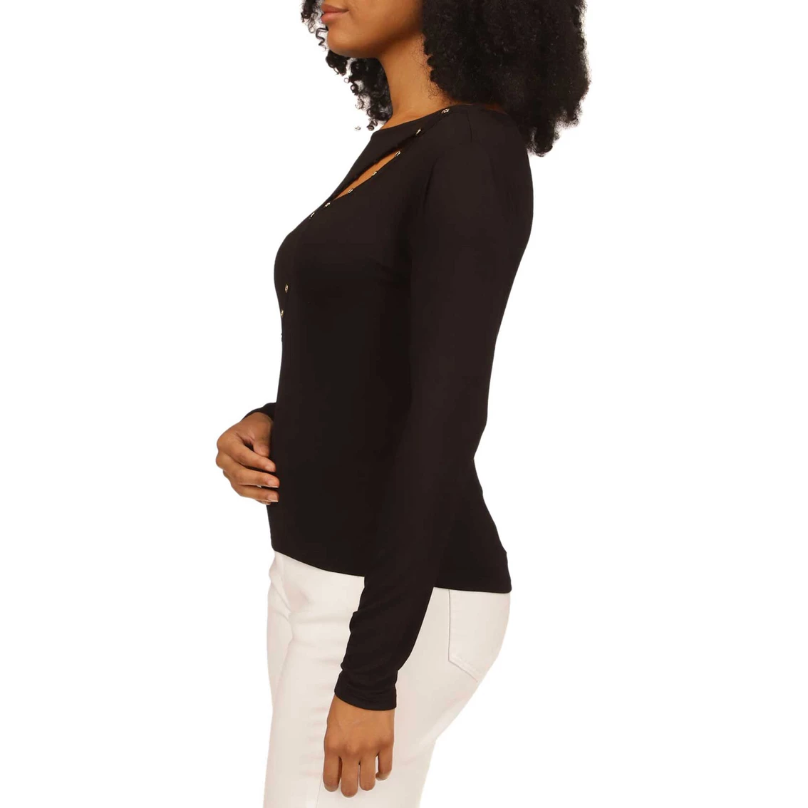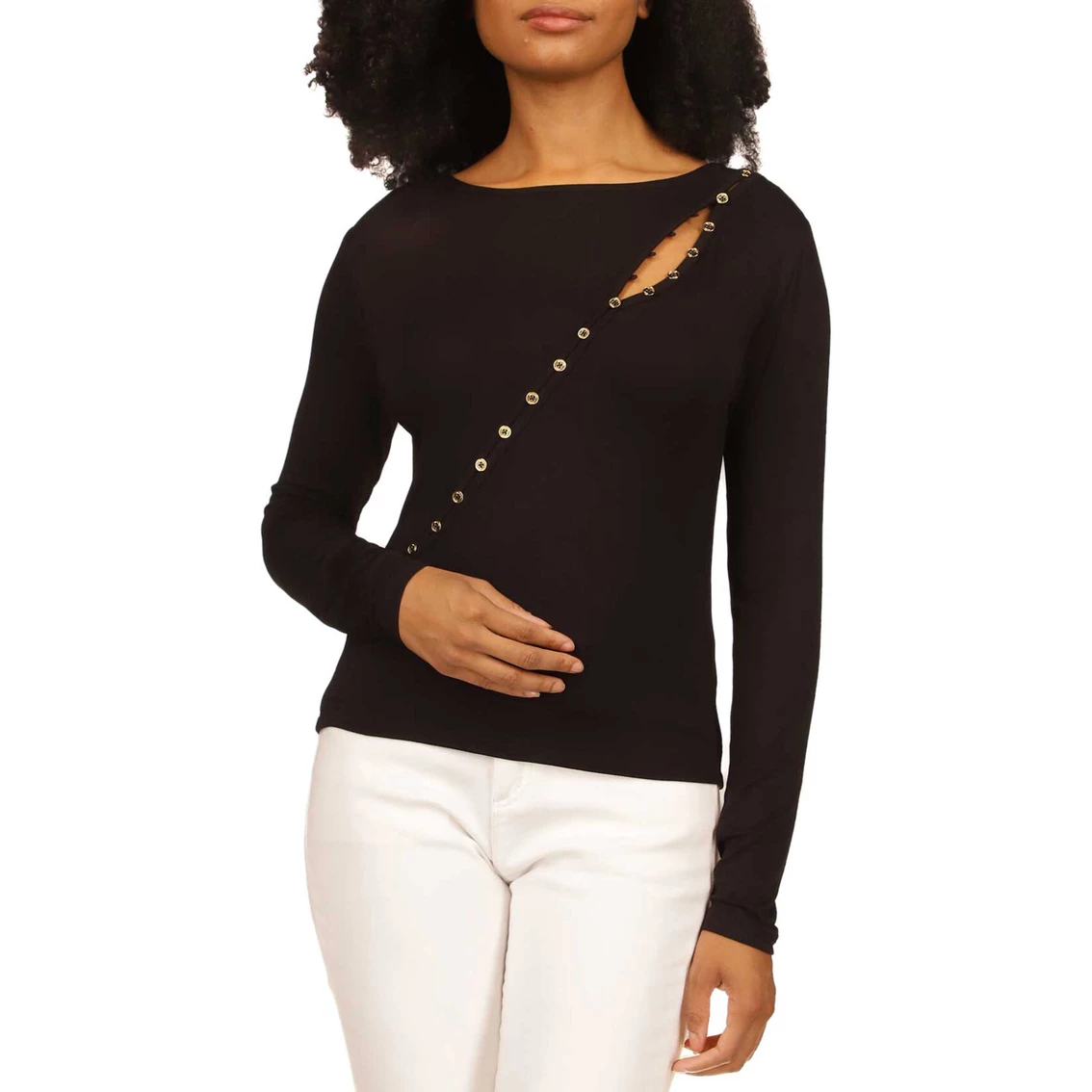 The classic silhouette of this long-sleeve top by Michael Kors has an asymmetrical design. Its soft fabric ensures all-day comfort. The top is machine washable for easy care. Style: MF250V3T45001.