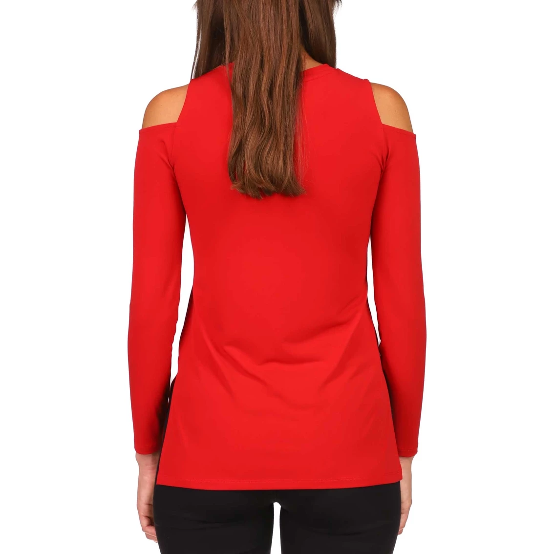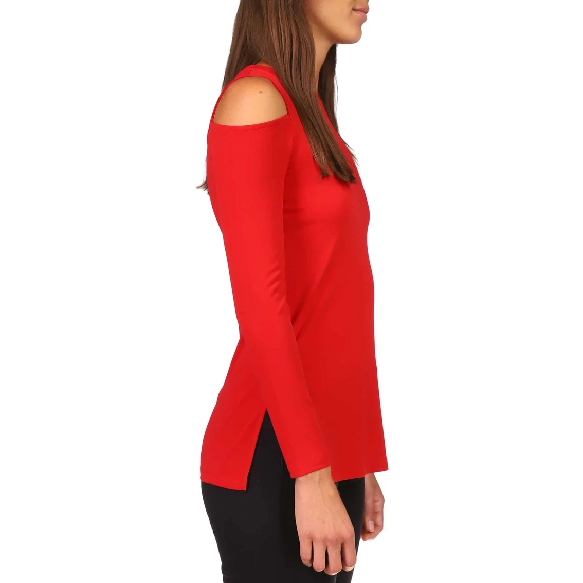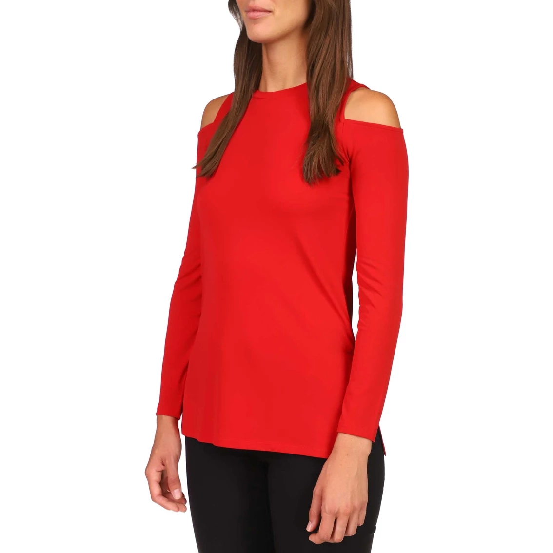 With long sleeves for warmth and a cold shoulder silhouette style, this knit Michael Kors top can be styled in an endless amount of looks. Made of polyester and spandex fabric, this top is breathable and stretchy. Style: MH15LMF03G.