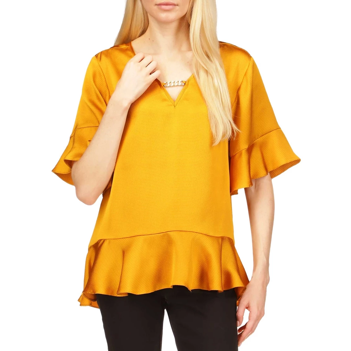 A cool flutter design from Michael Kors. Featured with a chain detail, this top can be dressed up or down for a versatile look. It will be your go-to this season.