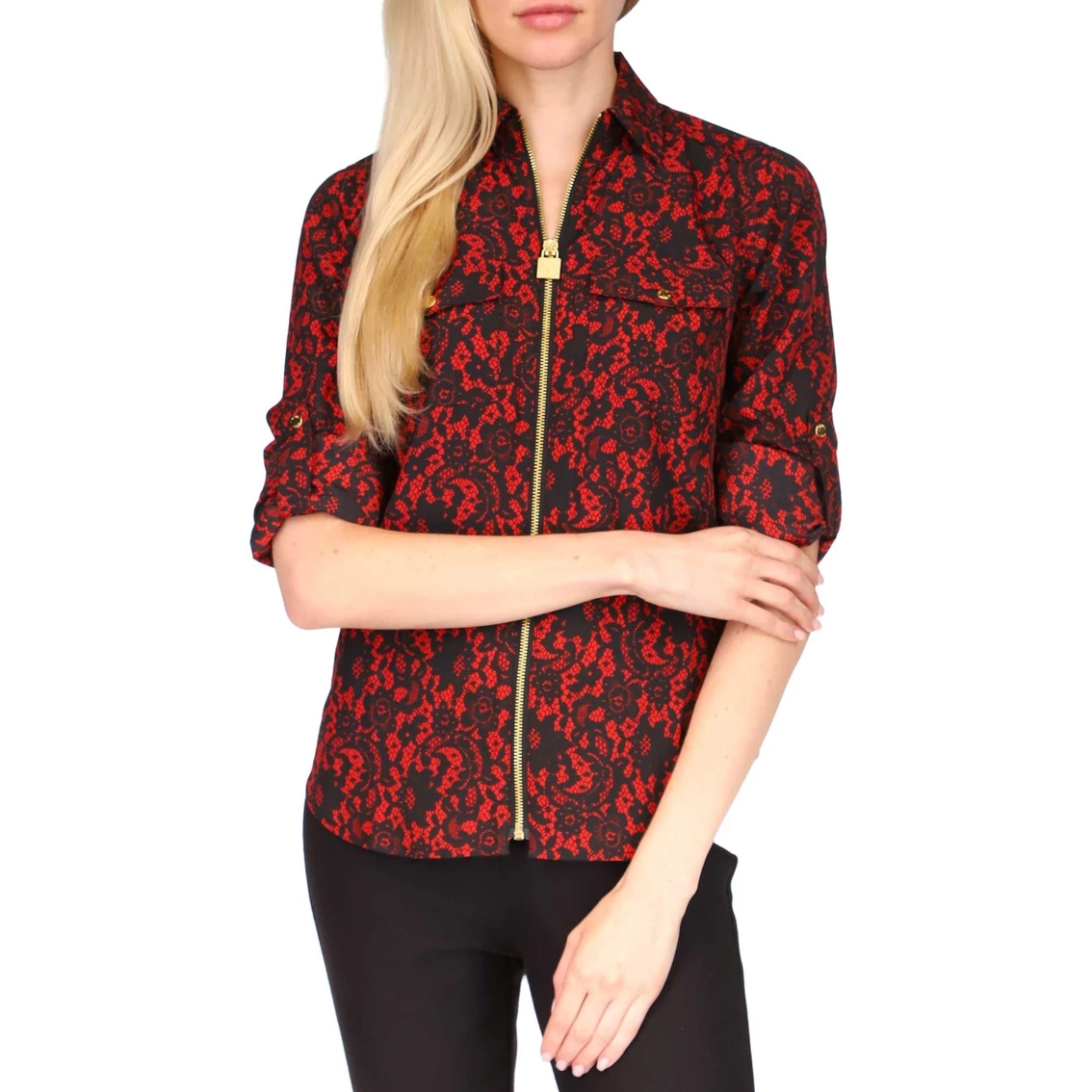 Long roll tab sleeves, an exposed zip and dog tag hardware accent this woven shirt from Michael Kors. This stylish top is warm and updated with lace print. Style: MH14LB74AS.