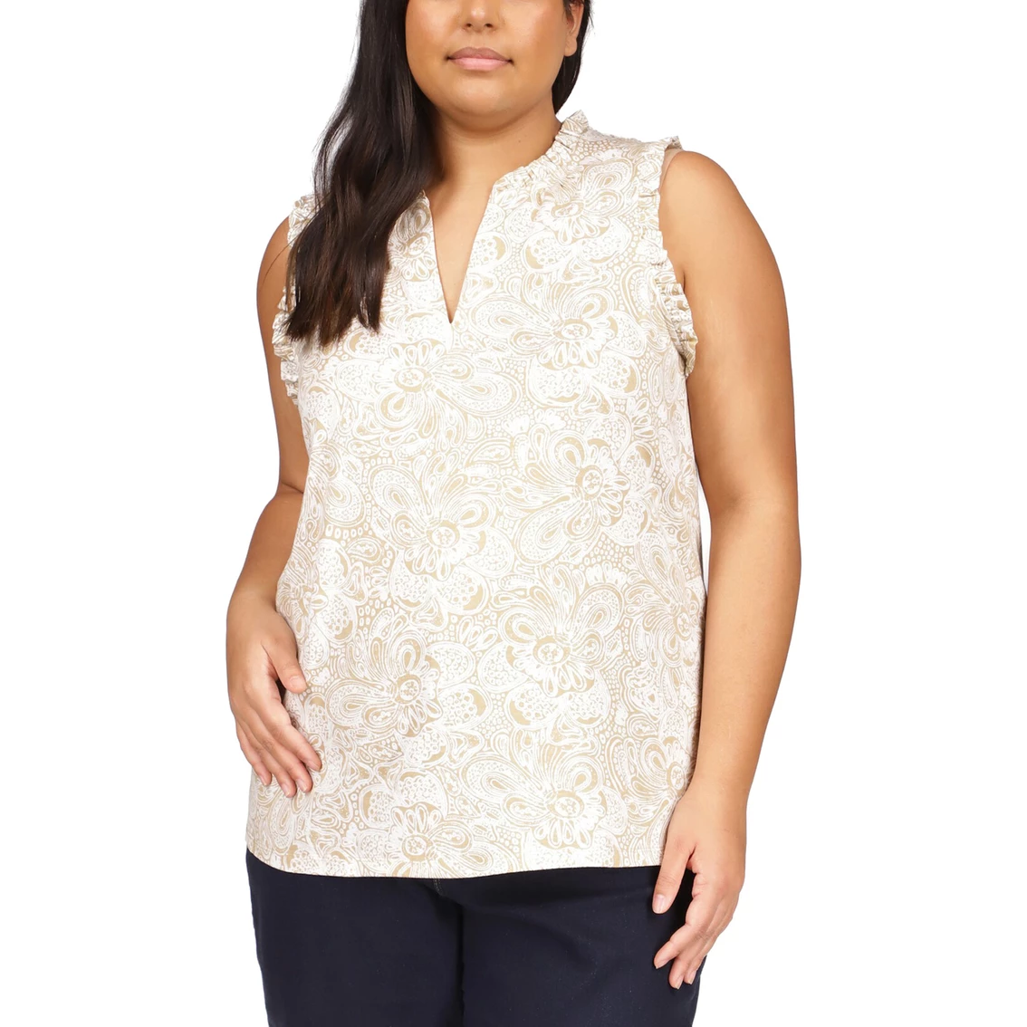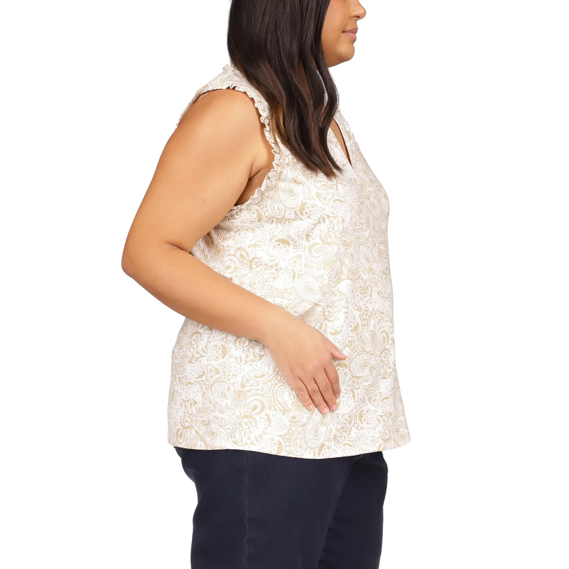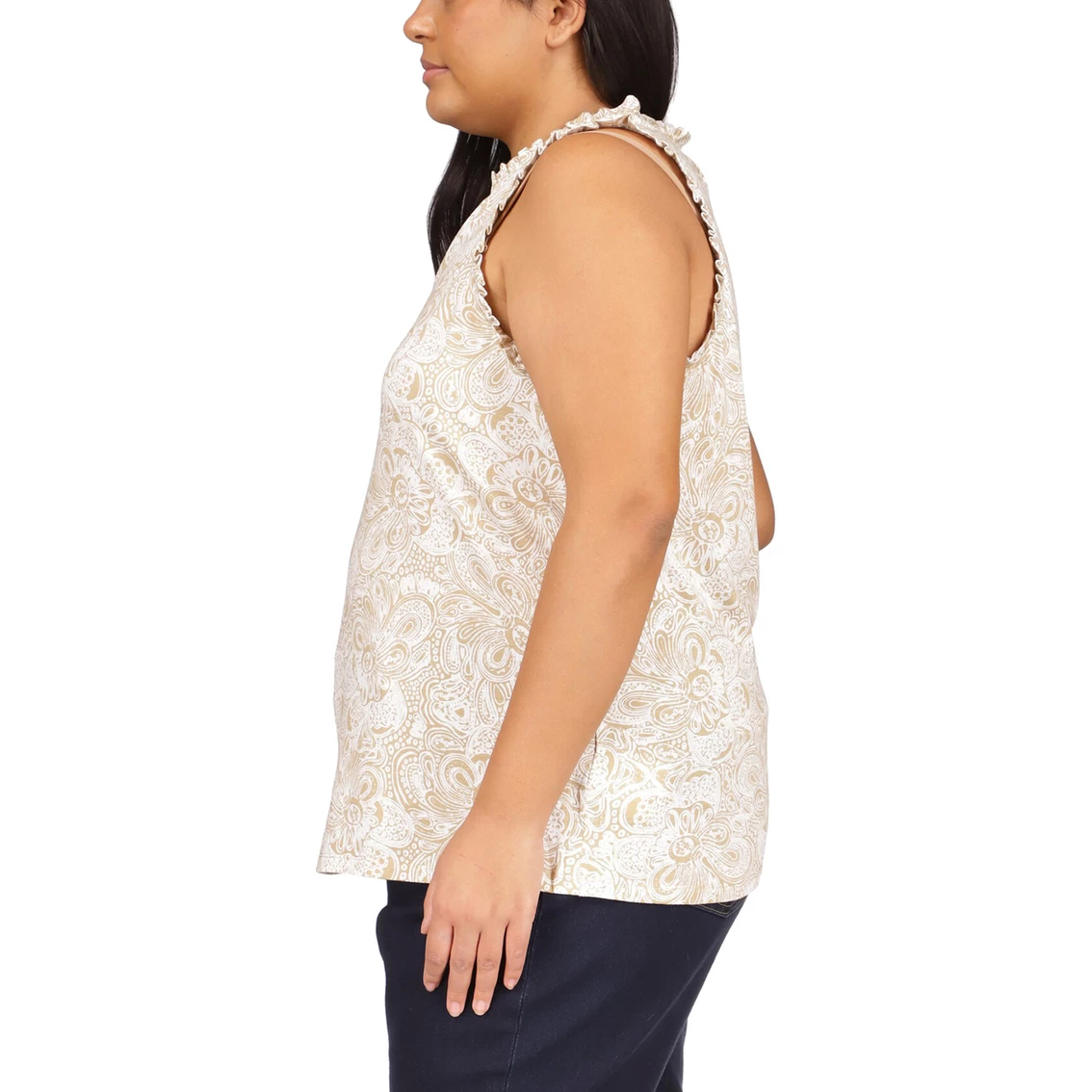 A paisley pattern accents this plus size tank top by Michael Kors. Ruffle details and a paisley print add flair. Style: WU250PV6E2.