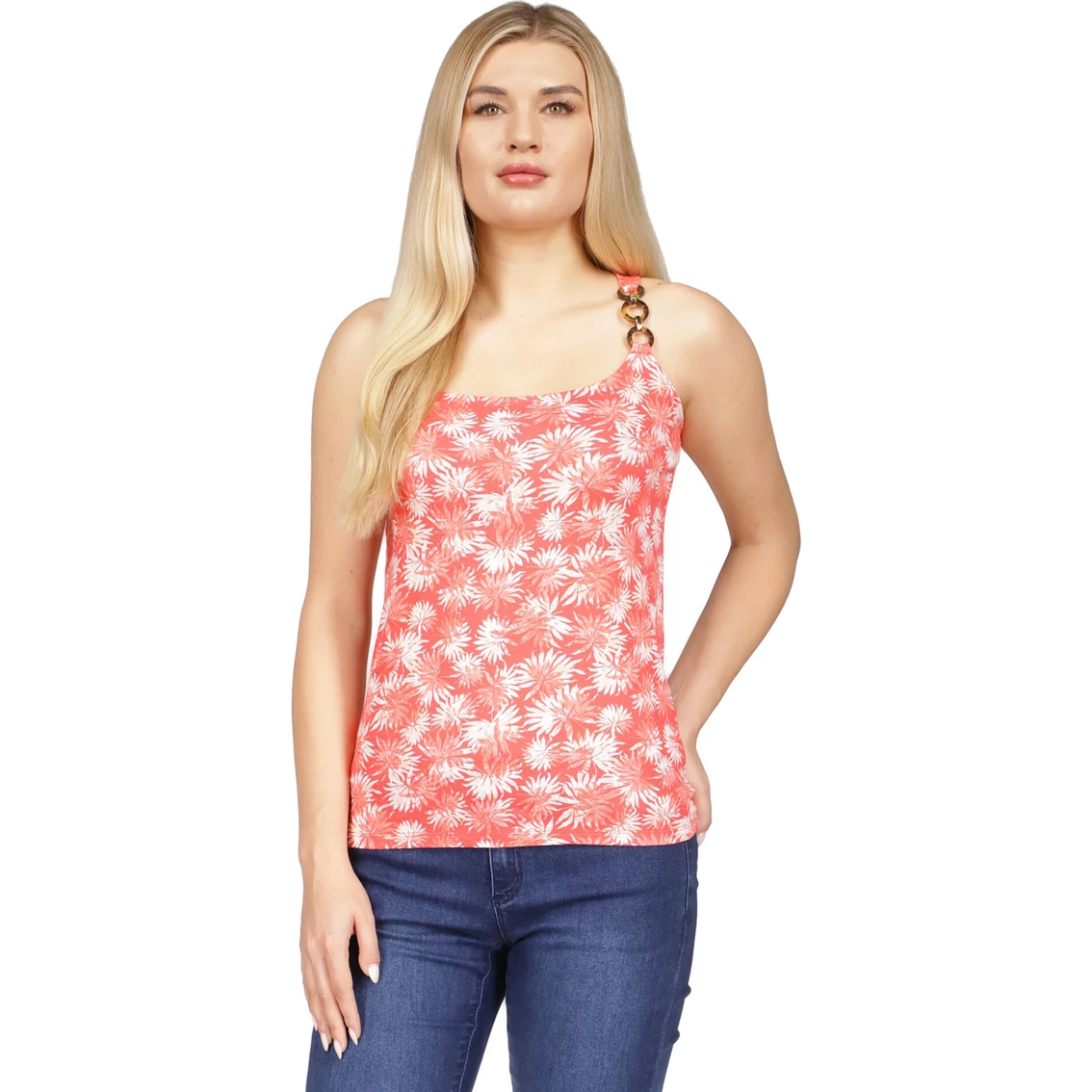 A comfortable and stylish women’s tank top from Michael Kors. MK ensures all eyes are on you with this sleeveless top featuring a three ring with print detail at the neck. Wear it as is or a layering piece underneath jackets and blazers. Perfect for work or a casual cool night out. Style: MU250R56E3.
