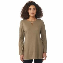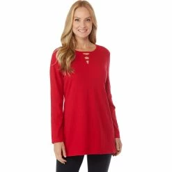 This women’s top from Passports brings a beautiful look to your silhouette. The tunic length offers the perfect amount of coverage. This long-sleeve top is made from a solid color crinkle knit fabric for comfort and has a fashionable lattice-like cutout detail at the front neckline. The top is machine washable for easy care. Style: PPF2102F22.
