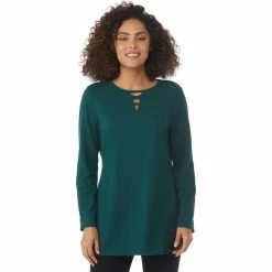 This women’s top from Passports brings a beautiful look to your silhouette. The tunic length offers the perfect amount of coverage. This long-sleeve top is made from a solid color crinkle knit fabric for comfort and has a fashionable lattice-like cutout detail at the front neckline. The top is machine washable for easy care. Style: PPF2102F22.