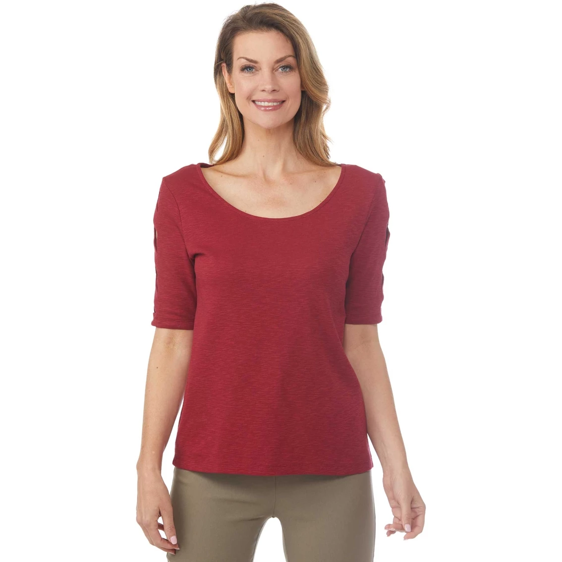 Take your summer style to the next level with this Passports Criss Cross Ladder Sleeve Top. This top is made from soft cotton for extra comfort. Pair with your favorite shorts or skirt to complete the look. Machine washable for easy care. Style: PPF20804F22A.