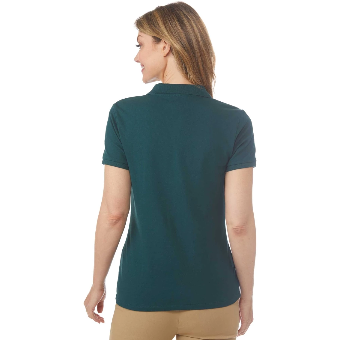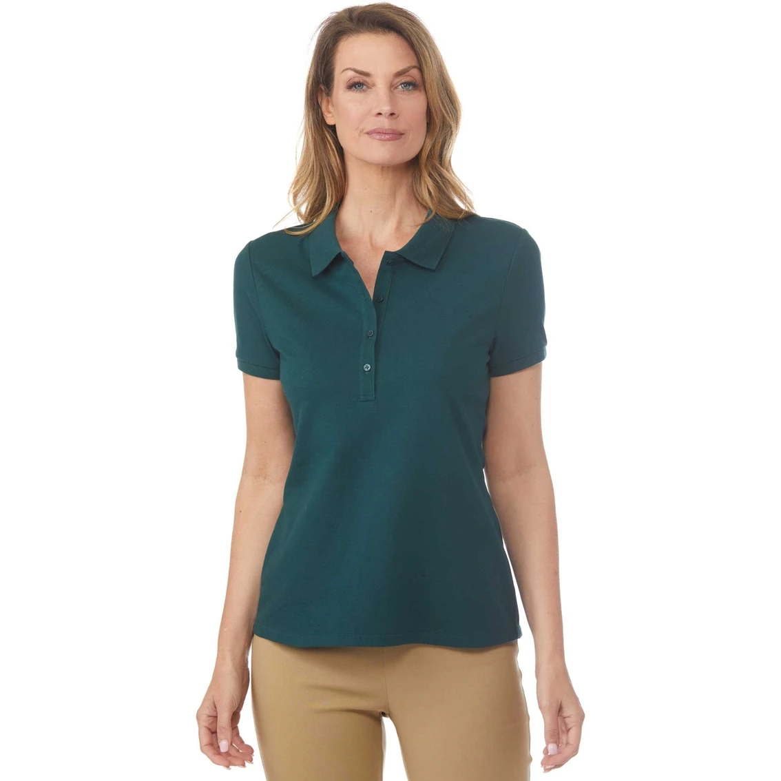 Versatility meets comfort in this Passports Pique Polo Top. This shirt features short sleeves. Made with cotton/spandex and soft pique knit. Machine wash for easy care. Style: PPS2103F22A.