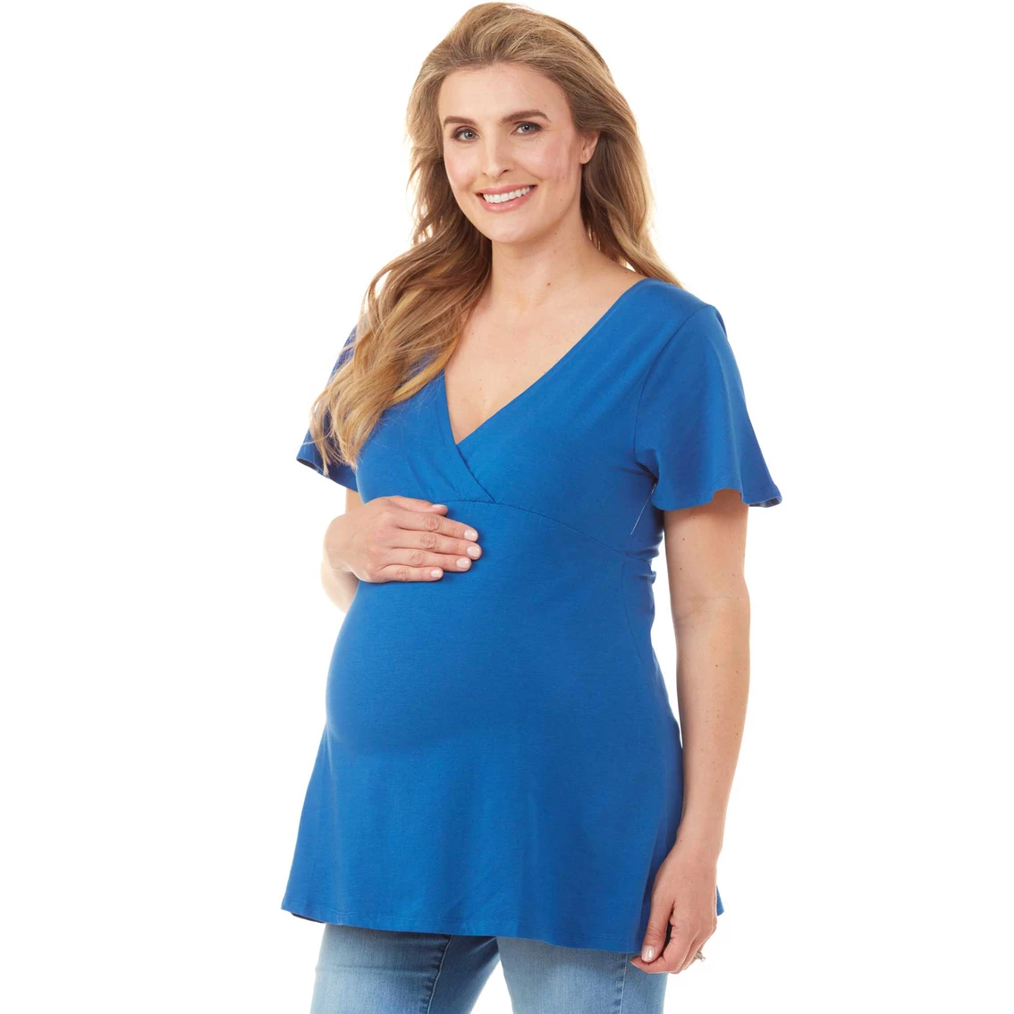 Mommy to be will feel cute and comfy in this Planet Motherhood Flutter Sleeve Faux Wrap Top. Made with short sleeves, it features an empire waisted faux wrap. The top is made from rayon and spandex. Machine wash for easy care. Style: J7498-BLU.
