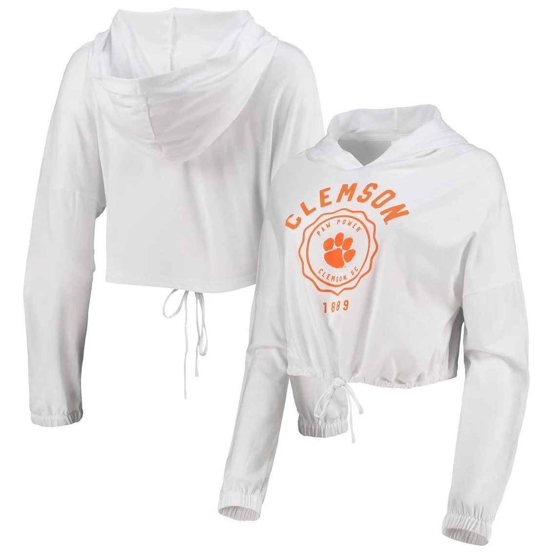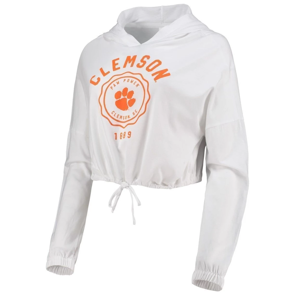 Promo βοΈ Summit Sportswear π© Women's White Clemson Tigers Poppy Cinched Cropped Hoodie Long Sleeve T-Shirt π