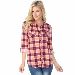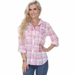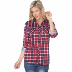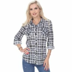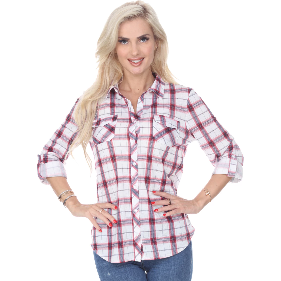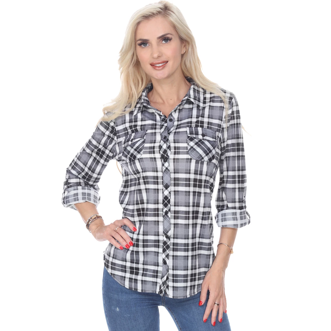 Buttery-soft fabric patterned in rustic plaid forms a relaxed button-front shirt from White Mark. It is perfect for layering over and under other pieces all year round. Style: 17555.