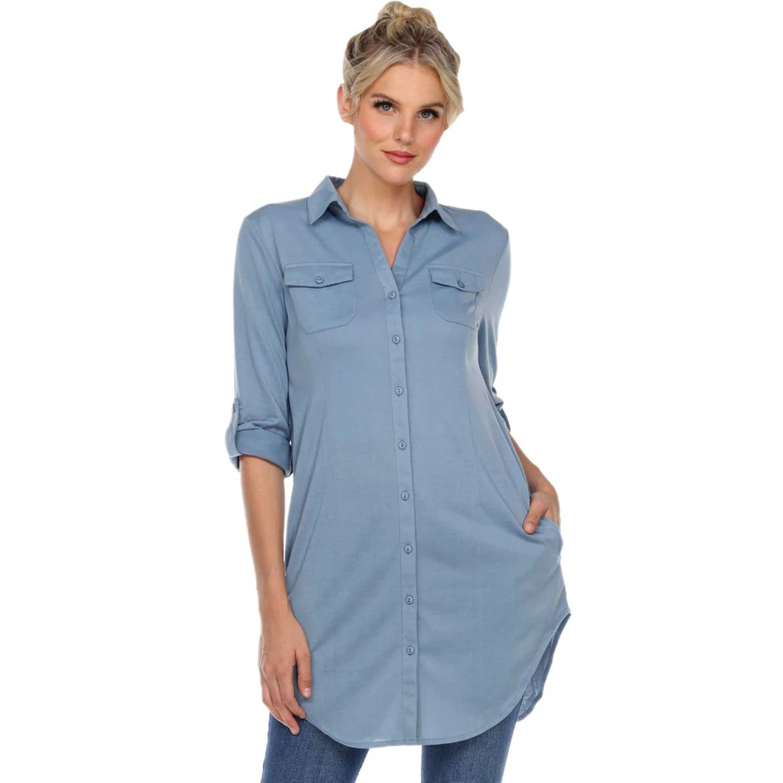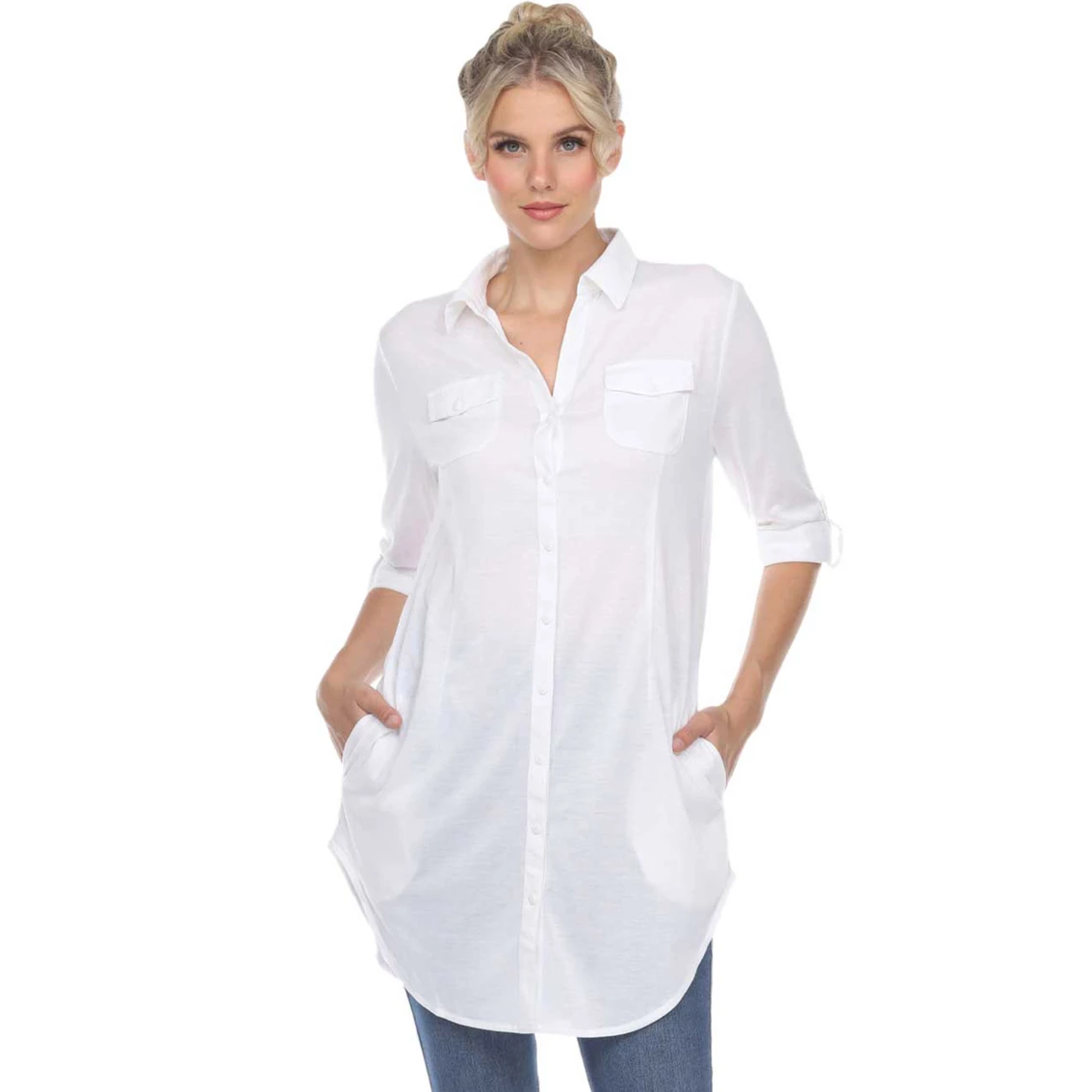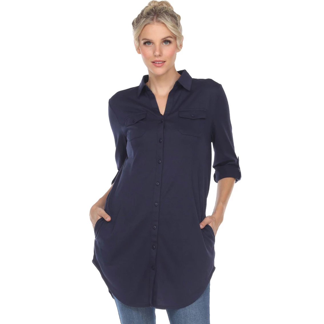 The Stretchy Button Down Tunic from White Mark offers classic style in a relaxed fit. This full front button color block tunic is a wardrobe staple with its long sleeves roll tab and functional side pockets. Features a buttery soft fabric and a shirt tail hem. Wear it alone with your leggings or jeans or layer it for more style. Style: 17586A650.