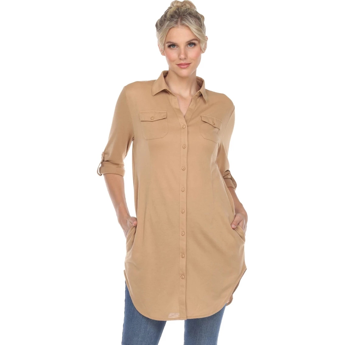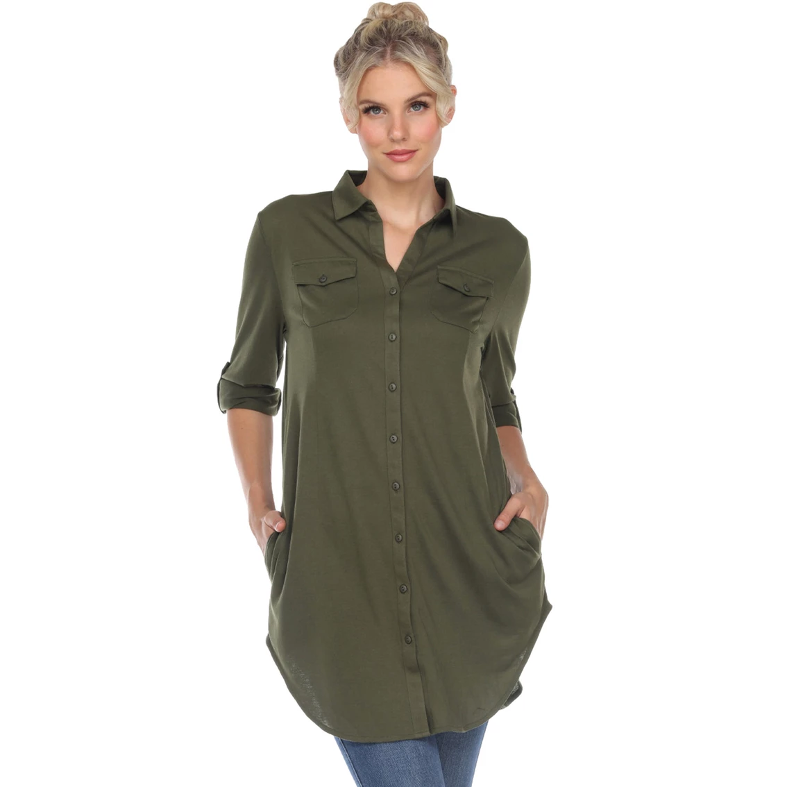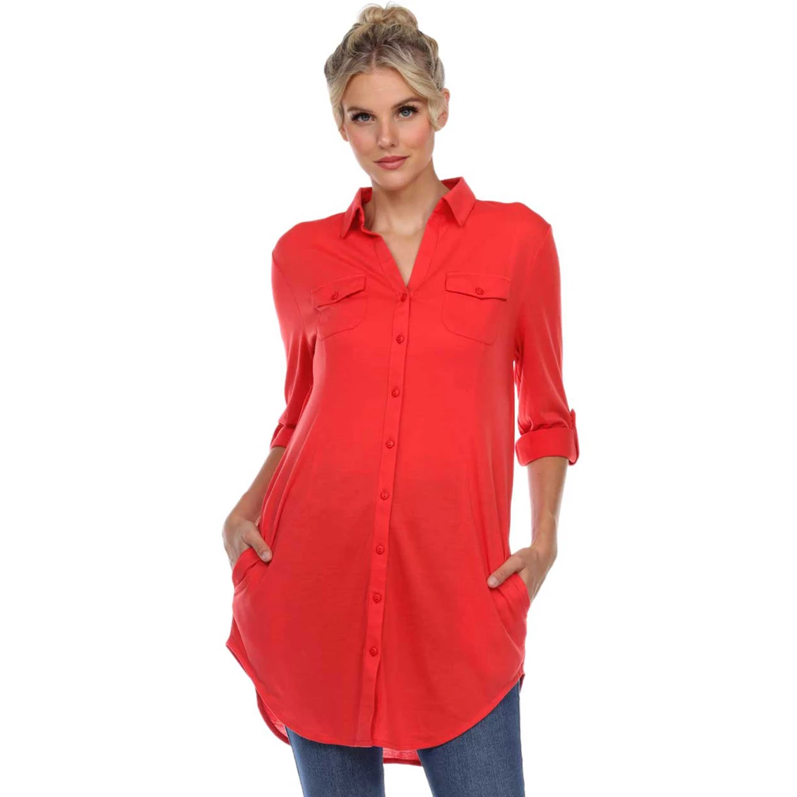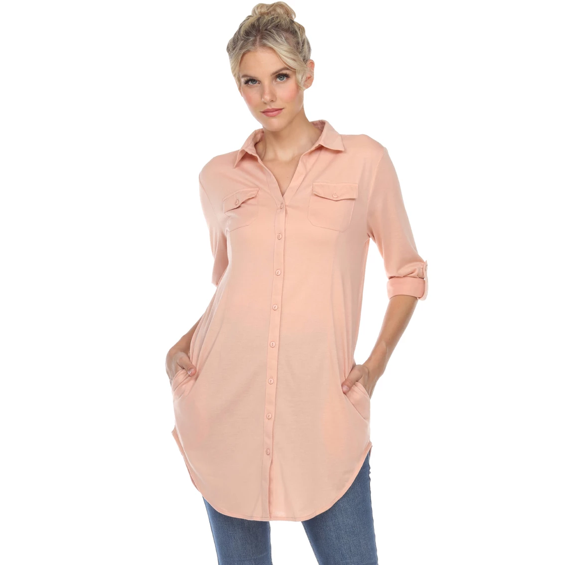 The Stretchy Button Down Tunic from White Mark offers classic style in a relaxed fit. This full front button color block tunic is a wardrobe staple with its long sleeves roll tab and functional side pockets. Features a buttery soft fabric and a shirt tail hem. Wear it alone with your leggings or jeans or layer it for more style. Style: 17586A650.