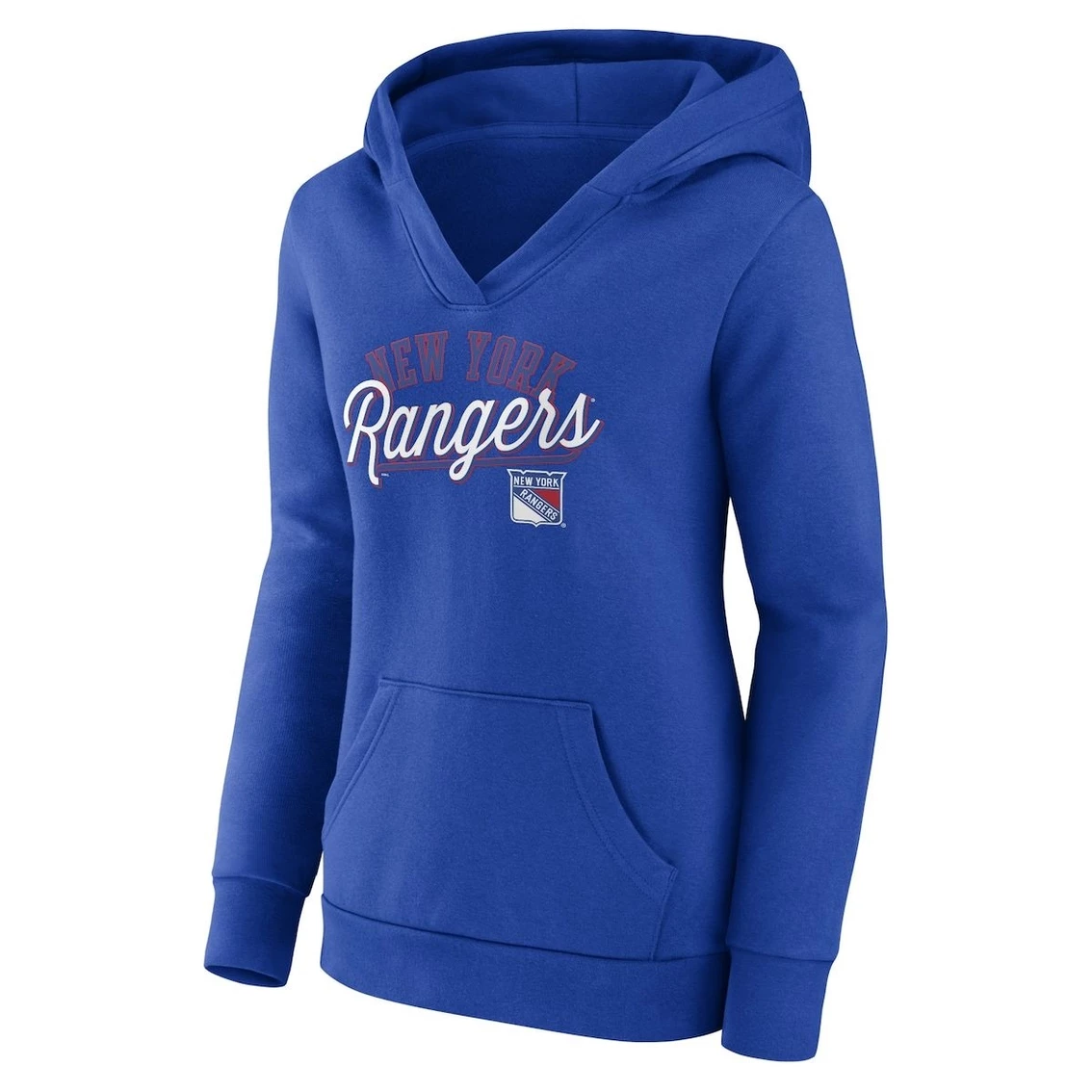 - Showcase your fiery New York Rangers devotion in this classic Fanatics Branded pullover hoodie. It features New York Rangers graphics printed across the chest along with a crossover V-neck to help you layer up in simple style. Plus, the front pouch pocket offers convenient storage while the hood provides additional coverage to keep you toasty throughout the day.