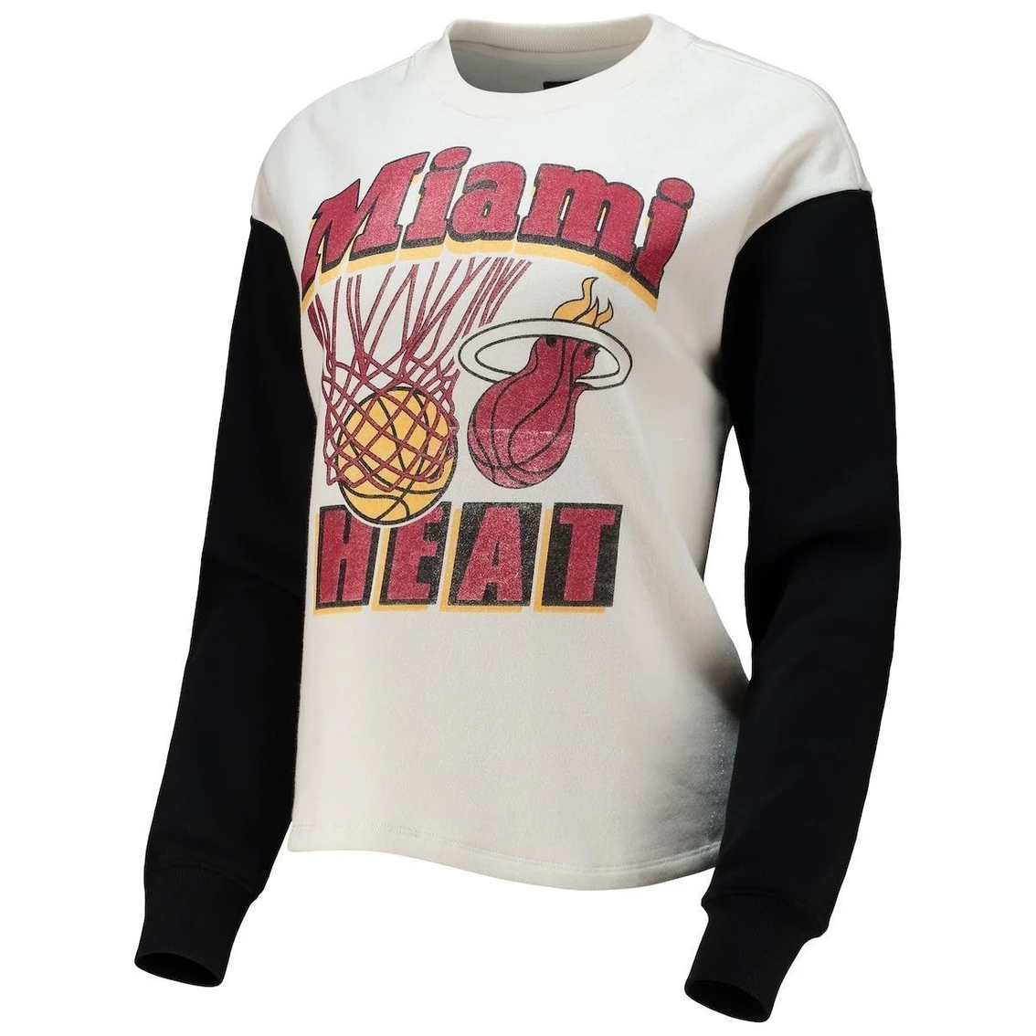 - Cheer on your Miami Heat in style with this Junk Food pullover sweatshirt. It features distressed team graphics with contrast-color sleeves for a vintage look and fleece lining for added warmth. Designed for a soft, cozy feel, this Miami Heat sweatshirt showcases where timelessness meets a comfortable fit.