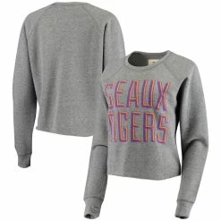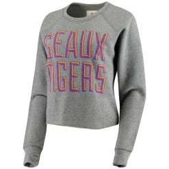 SKU: DSCO1142009675 Categories: Hoodies & Sweatshirts, Tops, Women's Clothing Tags: Clothing & Accessories, Hoodies & Sweatshirts, Pressbox, Women's Pressbox Heathered Gray LSU Tigers Sawyer Knobi Cropped Raglan Pullover Sweatshirt