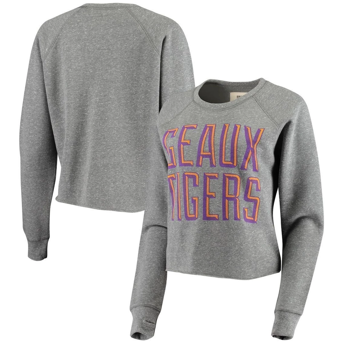 Hot Sale π Women's Pressbox Heathered Gray LSU Tigers Sawyer Knobi Cropped Raglan Pullover Sweatshirt π