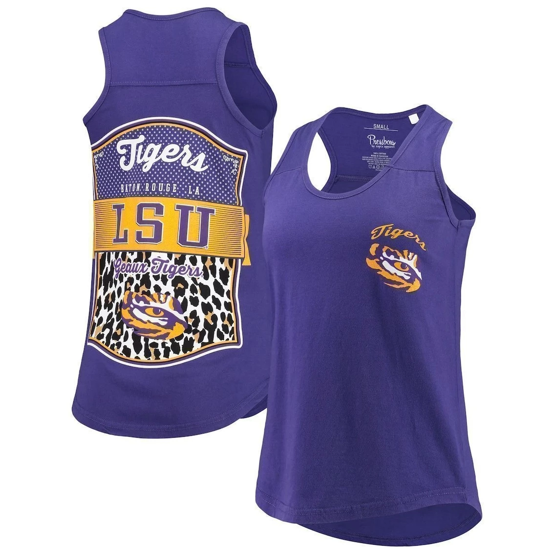 - Turn heads toward your LSU Tigers spirit when you wear this Sanders Animal Print tank top from Pressbox. It features subtle LSU Tigers graphics printed on the front and an eye-catching design with a wild side on the back. The cotton-polyester blend will also give this sleeveless shirt a lightweight, soft feel.