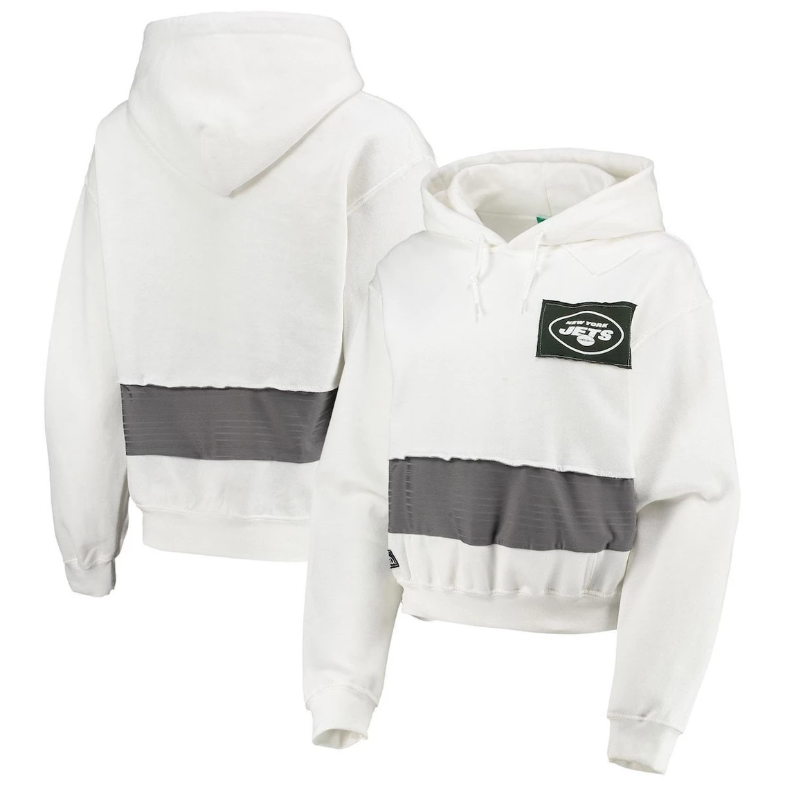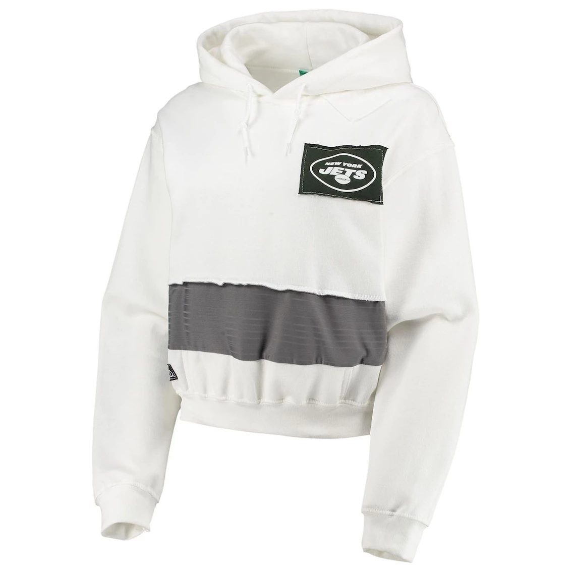 - On cooler New York Jets game days, stay warm and cozy in this Crop pullover hoodie from Refried Apparel. It features the official New York Jets logo at the top and a jersey-like panel near the bottom. This flattering design is upcycled from unsold inventory, providing a unique flair.