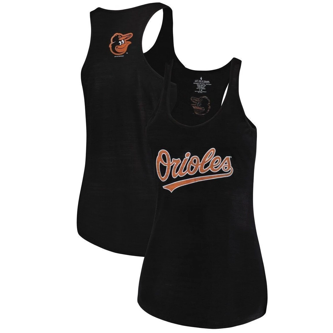 Comfortably embrace the excellence of your favorite team when you slip on this remarkable Baltimore Orioles Swing for the Fences racerback tank top from Soft as a Grape! Machine wash, tumble dry lowBurnout fabricMaterial: 50% Polyester/37% Cotton/13% RayonBrand: Soft as a GrapeImportedRacerbackOfficially licensedSizing Tip: Product runs true to size. For a looser fit, we recommend ordering one size larger than you normally wear.Model is X weight/height and wears a 1XSoft-touch, tagless racerback tank