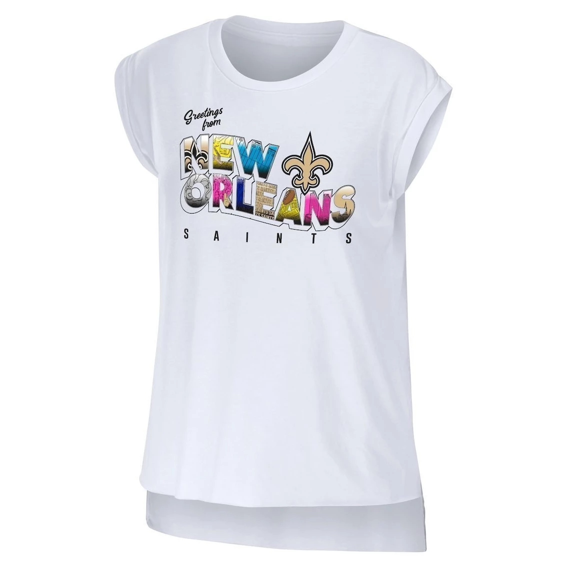 - Add a stylish piece of New Orleans Saints apparel to your rotation with this Greetings From Muscle T-shirt from WEAR by Erin Andrews. It features exciting postcard-like graphics on the front that show your loyalty to the team and their home city. The cotton is sure to keep you warm and comfortable while you cheer on the New Orleans Saints.